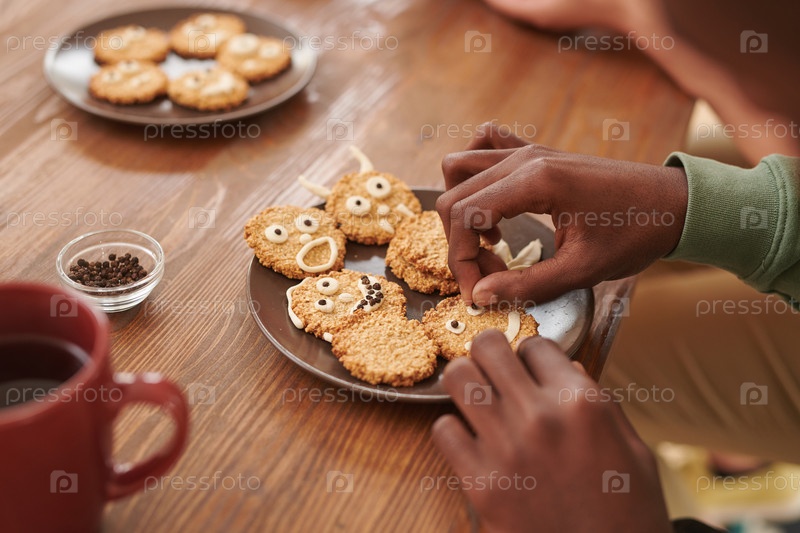 Близкий план афроамериканского мужчины, сидящего за деревянным столом и добавляющего смешной дизайн на сахарные печенье во время приготовления сладостей для Хэллоуина