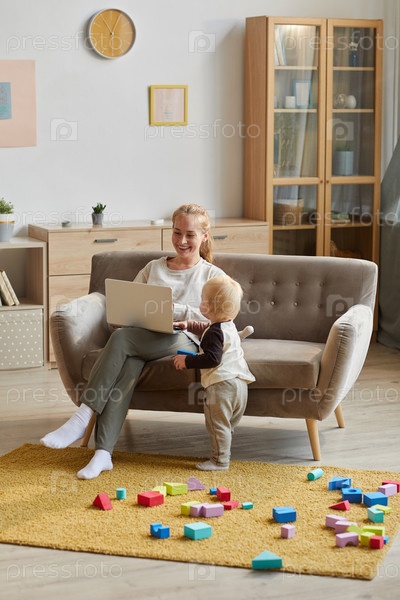 Мать, использующая ноутбук дома