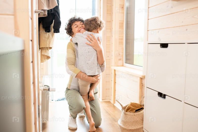 Молодая мать обнимает своего милого маленького сына после возвращения домой с работы