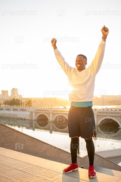 Счастливый молодой человек в спортивной одежде, держа руки поднятыми во время празднования победы