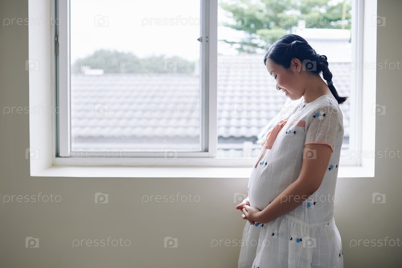 Беременная женщина смотрит на свой живот
