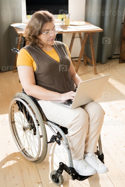 Молодая женщина-инвалид в повседневной одежде серфирует по сети или во время удаленной работы