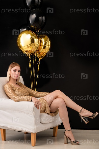Молодая блондинка роскошная женщина в платье золотистого цвета, сидящая в кресле