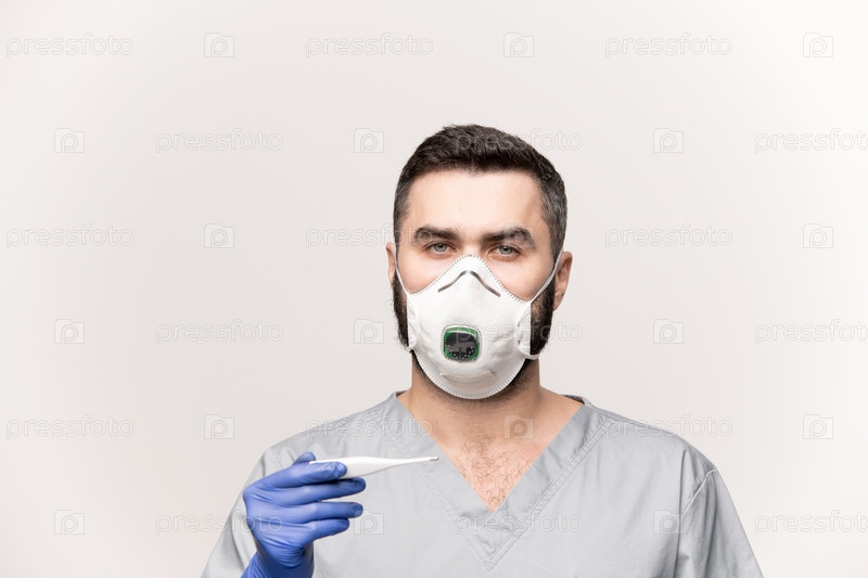 Молодой профессиональный врач в защитных перчатках, маске и серой форме