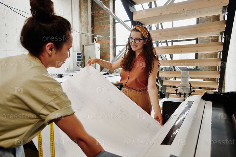 Два молодых дизайнера современной моды печатают большой эскиз новых предметов