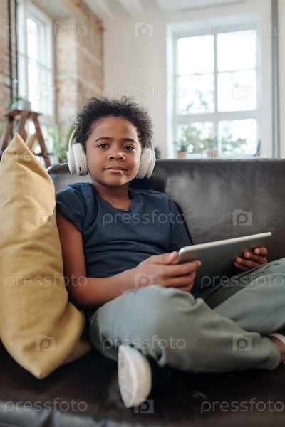 Счастливый мальчик с наушниками сидит на кожаном диване перед камерой