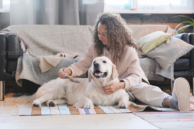 Женщина расчесывает собаку
