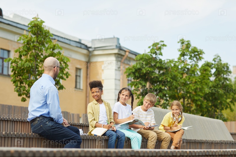 Мультиэтническая группа детей, слушающих учителя на открытом воздухе