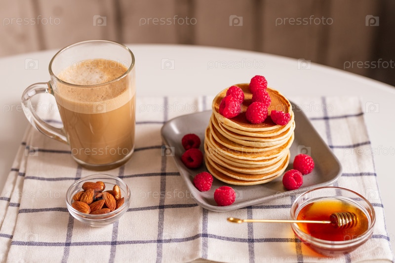 Чашка с ароматическим капучино, блины со малиной, миндальными орехами и медом