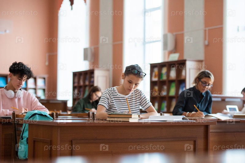 Девушка-подросток и другие студенты колледжа делают заметки в копиях