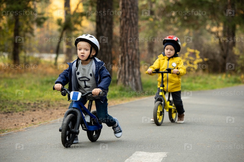 Два милых мальчика в обычной одежде и шлемах безопасности ездят на своих велосипедах с балансом