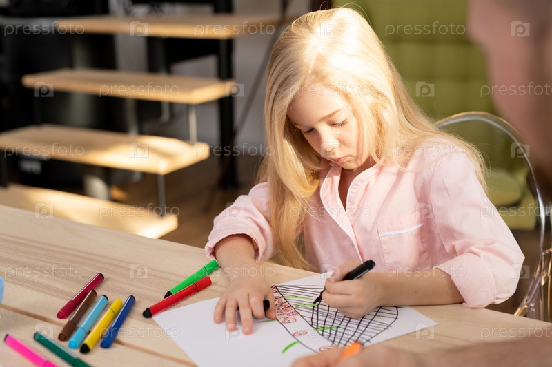 Блондинка наклоняется над деревянным столом, рисуя с помощью маркировщиков
