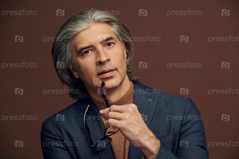 Портрет уверенного зрелого бизнесмена с седыми волосами, держащего очки рядом со своим лицом и размышляющего над новым проектом