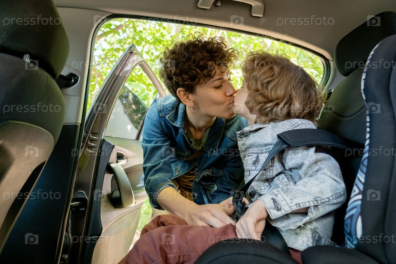 Молодая ласковая женщина в джинсовой куртке целует своего милого маленького сына на рот