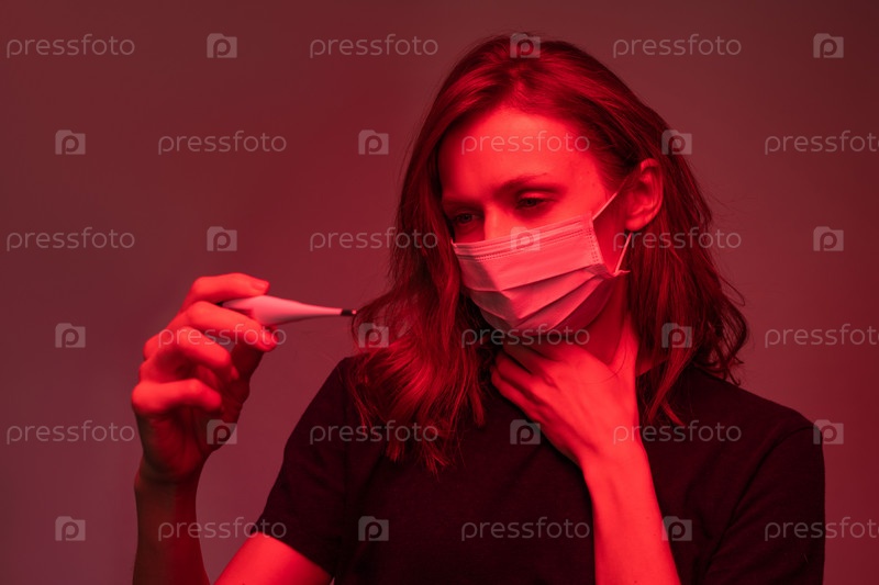 Молодая женщина в маске касается ее горла и измеряет температуру