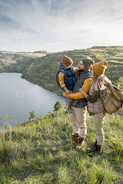 Молодой отец держит своего маленького сына за руки с женщиной, стоящей рядом с ними