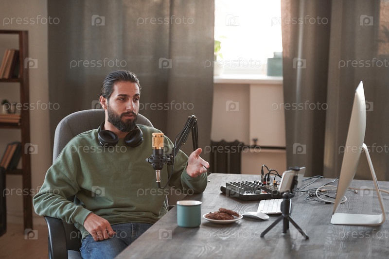 Портрет молодой ближневосточной влиятельной личности, расслабленно сидящей за столом в комнате на чердаке, создающей контент для блога и смотрящей на камеру смартфона