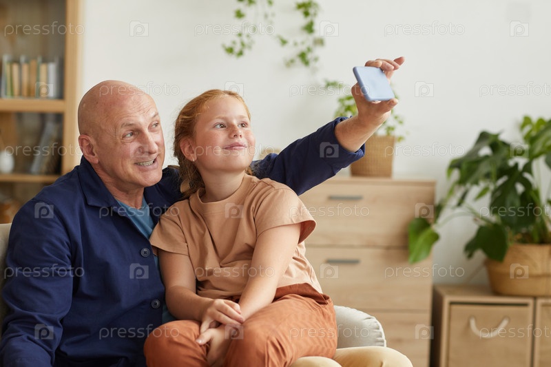 Старший мужчина делает селфи с внучкой