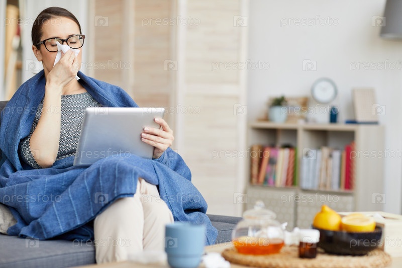 Больная женщина с планшетным компьютером дома