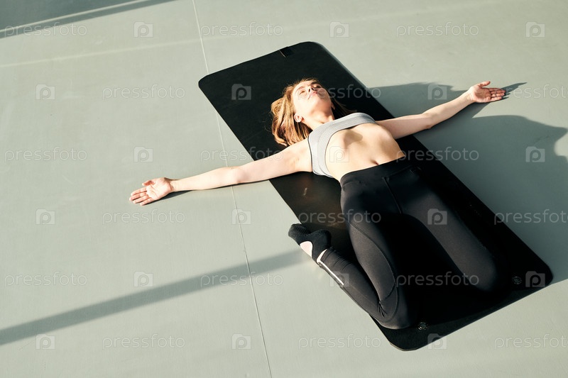 Довольно активная девушка в спортивном костюме, лежащая на черном коврике с распростертыми руками