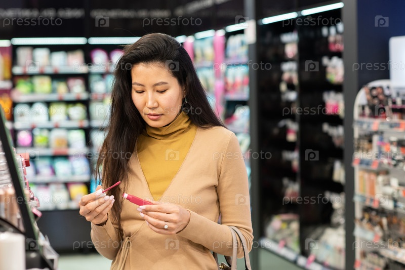 Молодая азиатская женщина с длинными черными волосами выбирает блеск для губ, держа тест