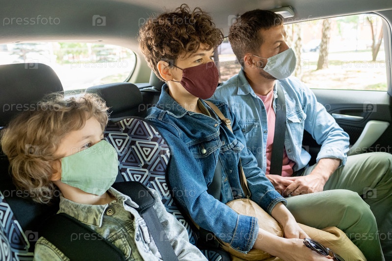 Ряд современной молодой семьи из трех человек в защитных масках едут на машине