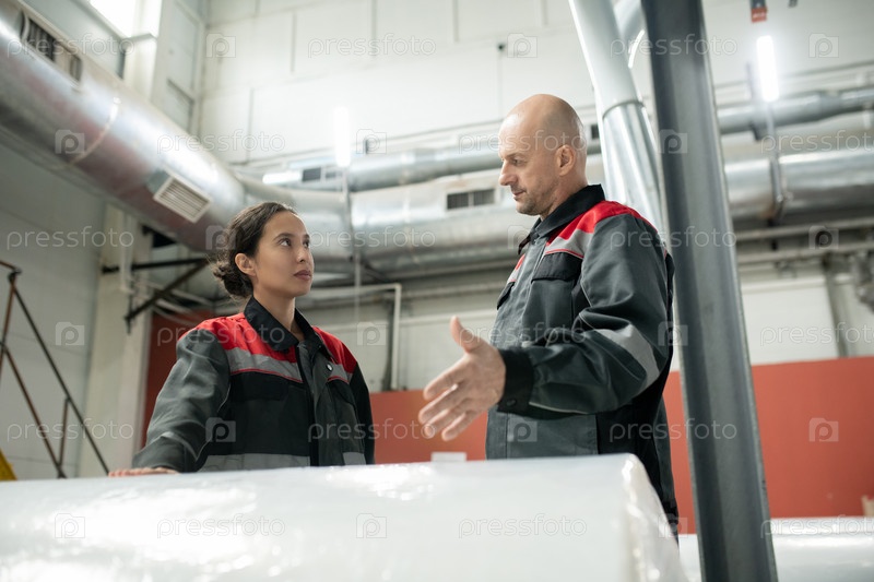 Молодые коллеги стоят рядом с огромным упакованным свитком и консультируются, прежде чем распаковать его