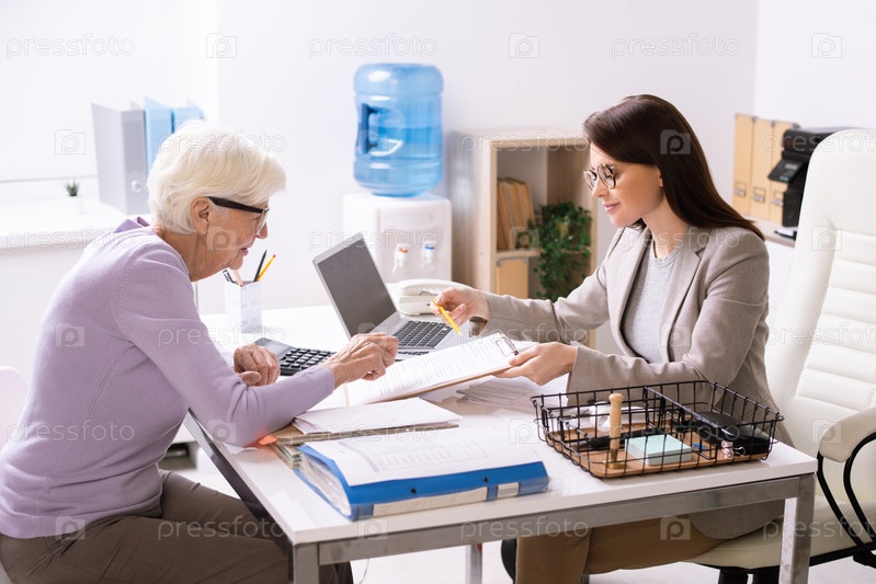Красивая молодая женщина-агент помогает старшему клиенту заполнить страховой документ