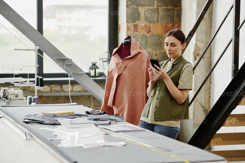 Современный молодой дизайнер модной коллекции прокручивает в смартфоне