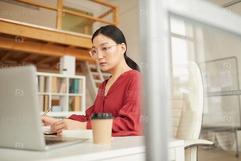 Азиатская бизнесвумен, использующая современный ноутбук