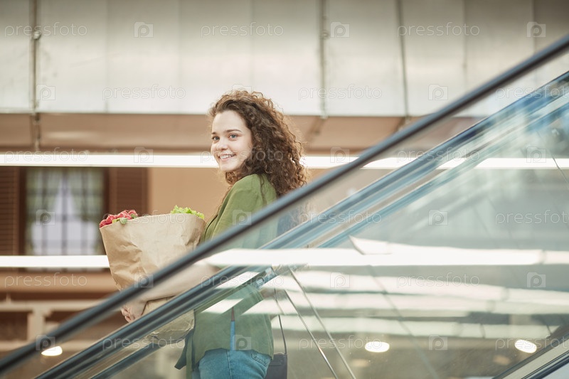 Женщина Happy Ypung, держащая сумку с продуктом на эскалаторе