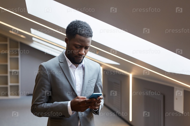 Африканский бизнесмен держит смартфон в сером офисе
