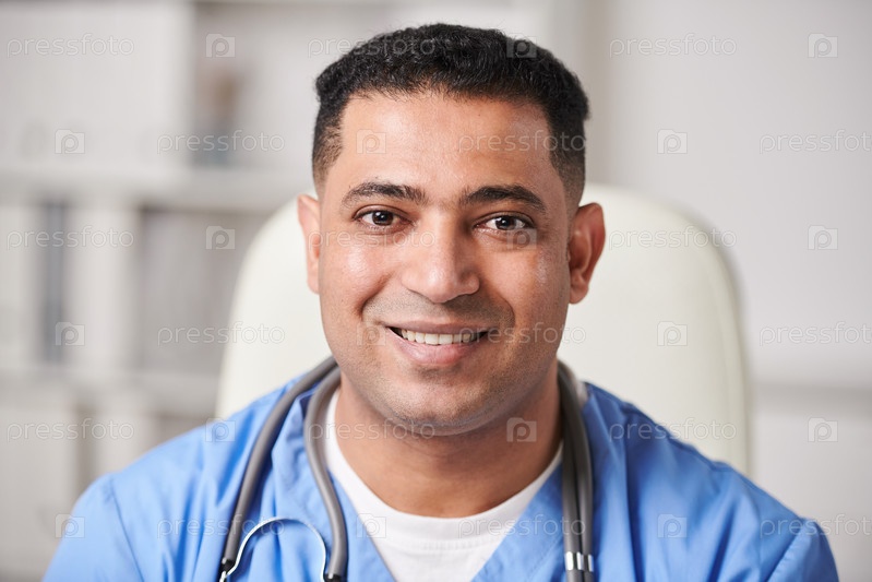 Горизонтальный крупный портрет счастливого молодого взрослого медицинского работника с Ближнего Востока, который смотрит на камеру и улыбается