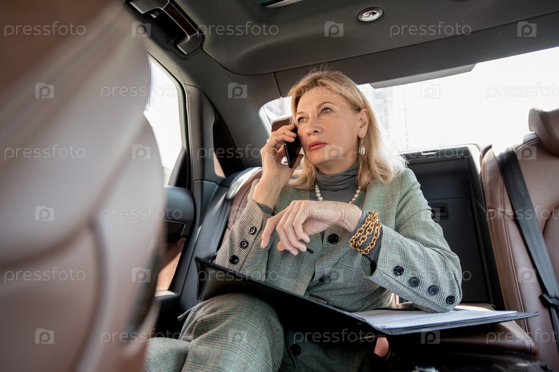 Зрелая деловая женщина сидит на заднем сиденье такси и звонит партнеру