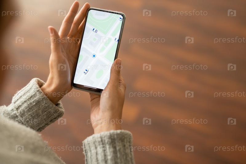 Руки современной молодой женщины в сером вязанном свитере, использующей смартфон