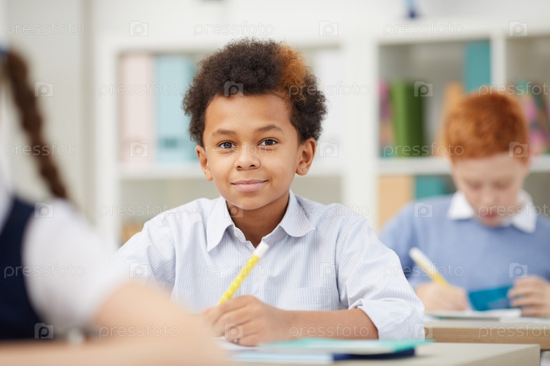 Африканский школьник, работающий в классе