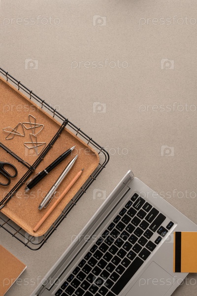 Плоская планировка кредитной карты на клавиатуре ноутбука, корзина с двумя ручками и карандашом
