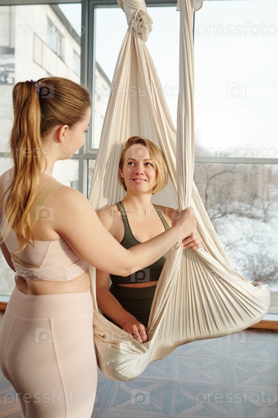 Счастливая молодая блондинка в спортивном костюме, сидящая на белом гамаке во время тренировки
