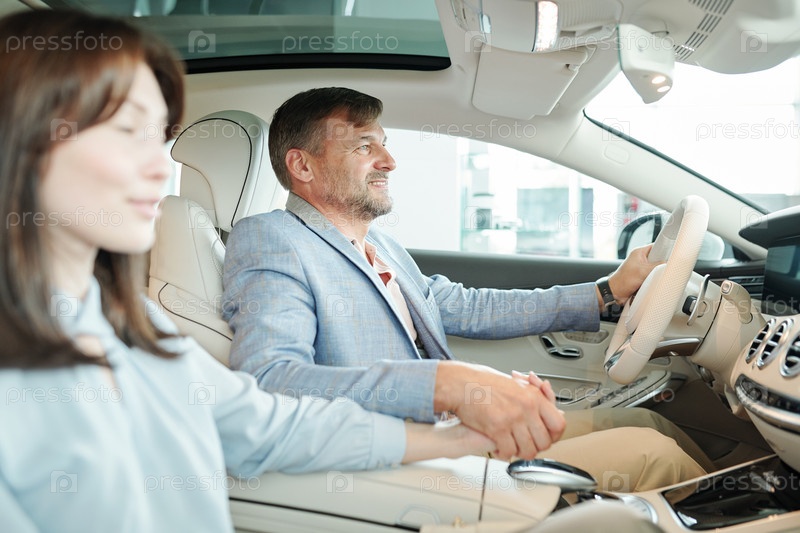 Зрелый элегантный мужской клиент современного автоцентра, держащий свою жену за руку