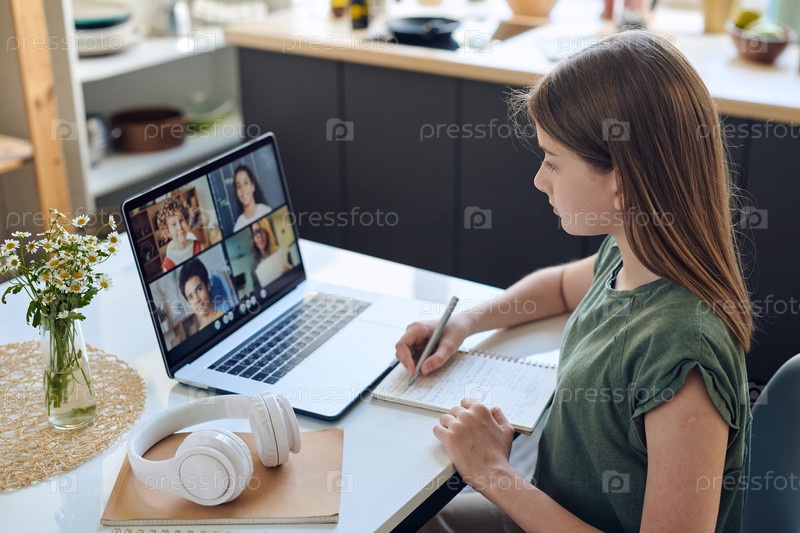 Блондинка умная школьница с ручкой на странице блокнота, смотрящая на дисплей ноутбука