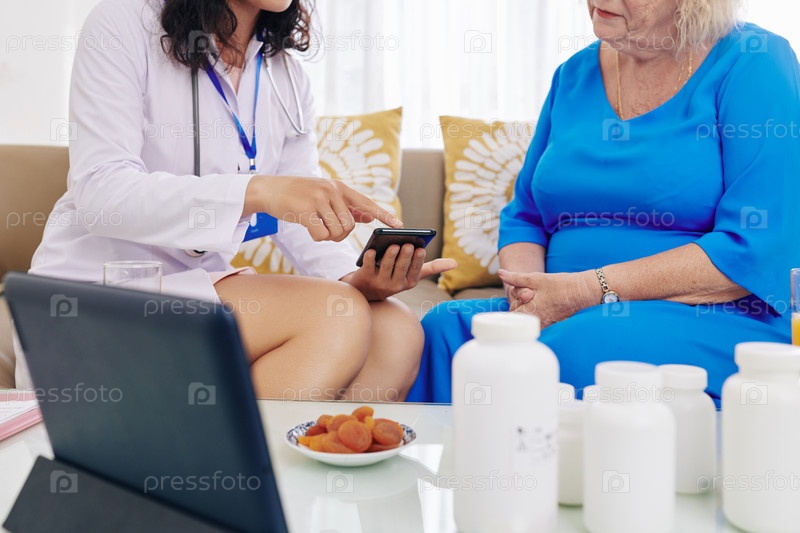 Врач показывает пациенту приложение для здоровья