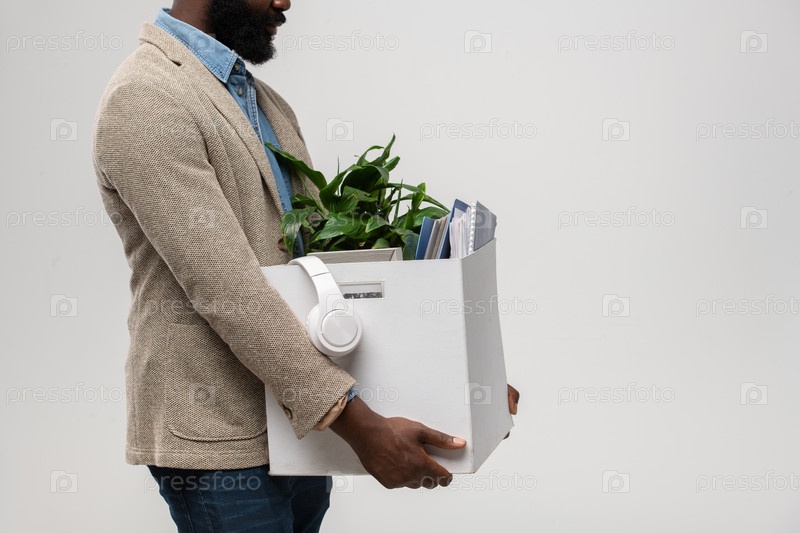 Боковой вид молодого уволенного менеджера в формальной одежде, несущего коробку с канцелярскими принадлежностями
