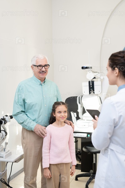 Счастливый пожилой человек со своей внучкой, стоящей перед офтальмологом