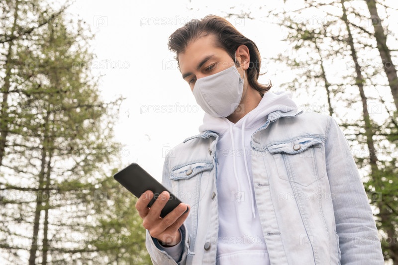 Молодой человек в джинсовой куртке, хаусине и маске прокручивает или отправляет текстовые сообщения на смартфоне