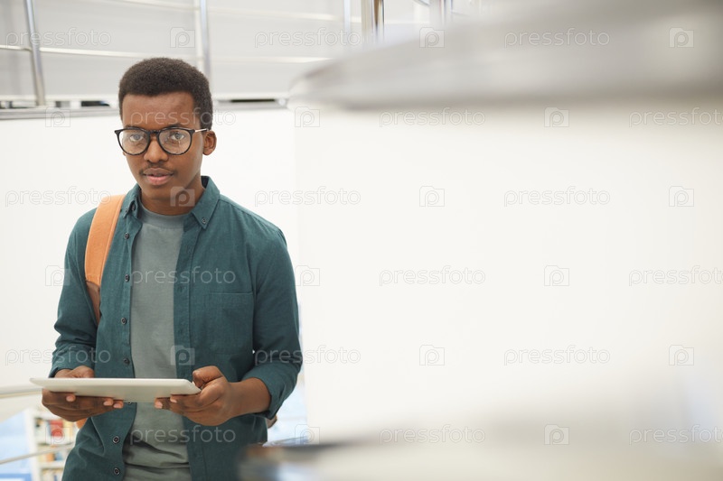 Молодой африканский мужчина держит планшет в колледже