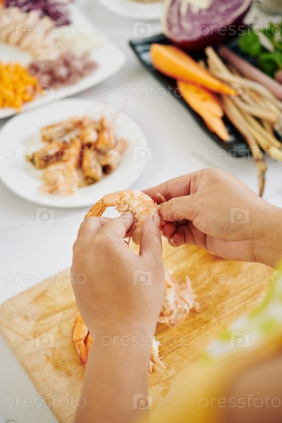 Женщина очищает приготовленные креветки