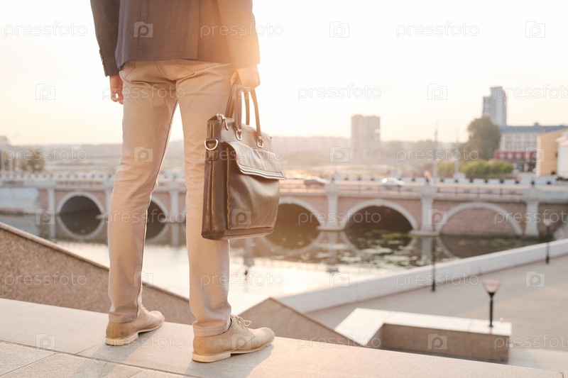 Задний вид молодого элегантного бизнесмена с сумочкой, стоящего на вершине лестницы