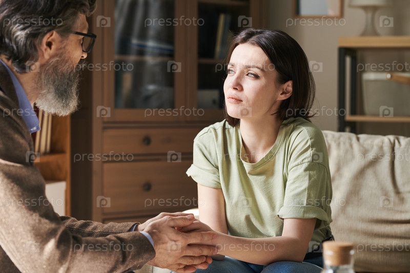 Молодая несчастная брюнетка сидит перед пожилым профессиональным психологом