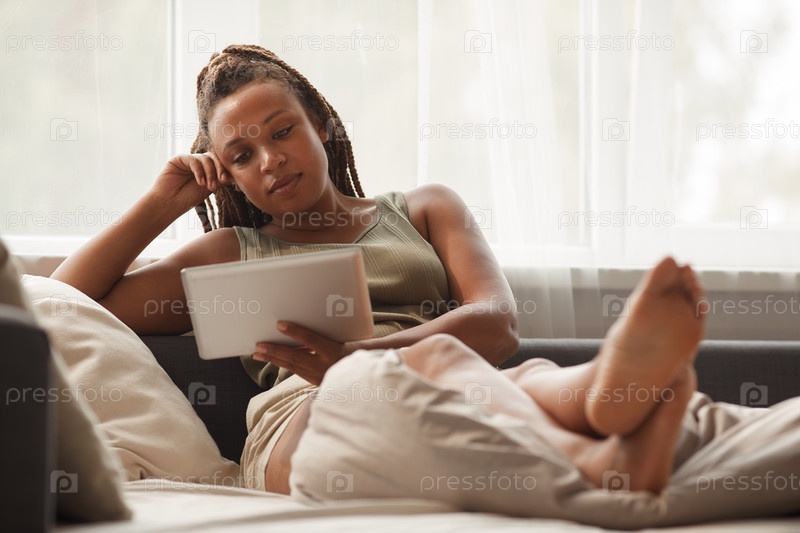 Женщина, использующая планшетный компьютер дома