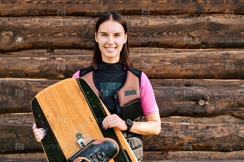 Активная молодая веселая женщина-серфер в защитном жилетке, держащая свою доску для серфинга